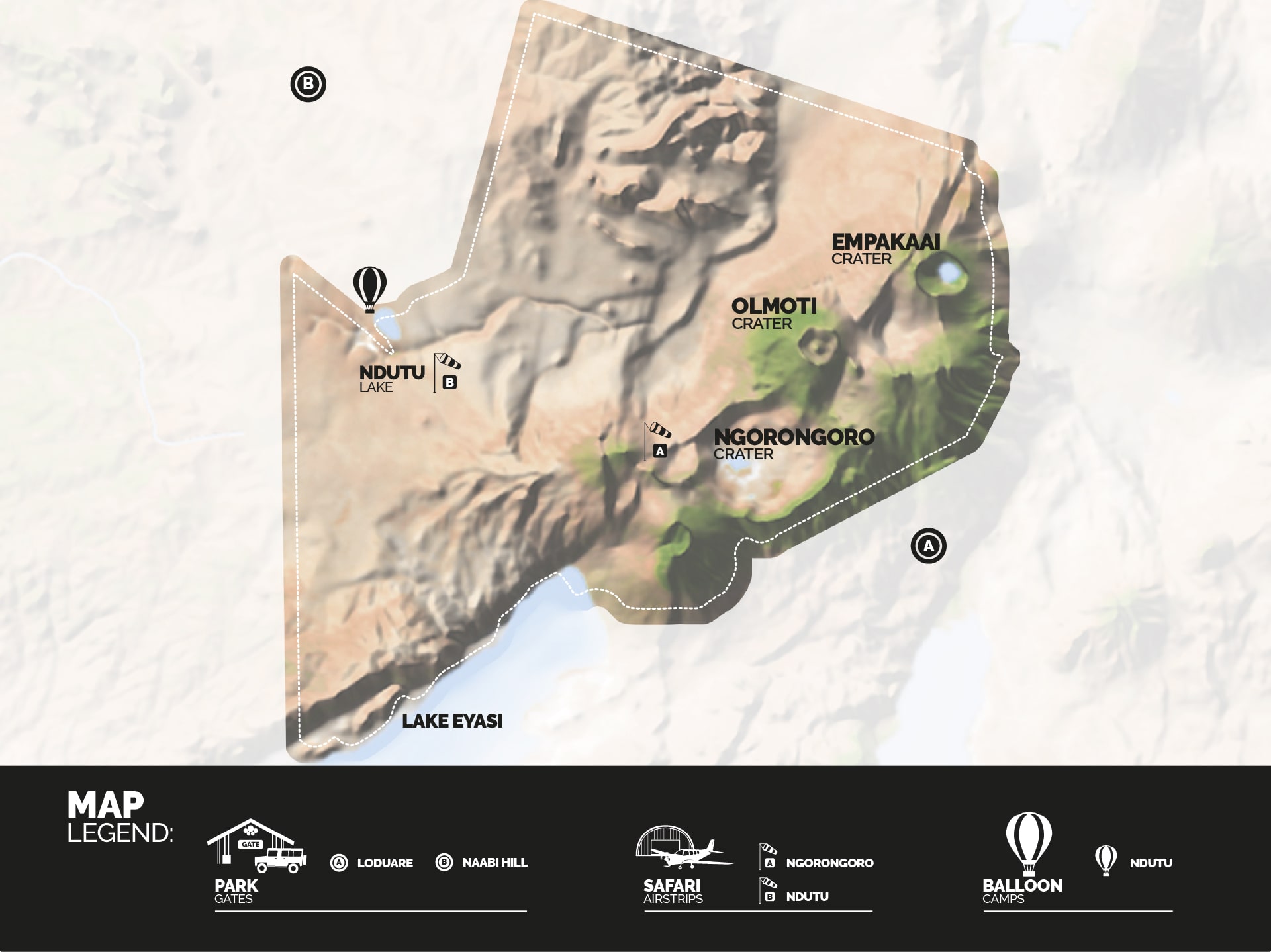 L’area situata a nord-ovest della città di Arusha, a est del Parco Nazionale del Serengeti e ad ovest della scarpata occidentale della Great Rift Valley, si estende per 8.300 km² e comprende, oltre al famoso Cratere di Ngorongoro (2.200 m) da cui prende il nome, diversi altri vulcani spenti: l’Oldeani (3.216 m), il Makarot (3.107 m), l’Olmoti (3.100 m), il Loolmalasin (3.648 m) e l’Empakaai (3.262 m).