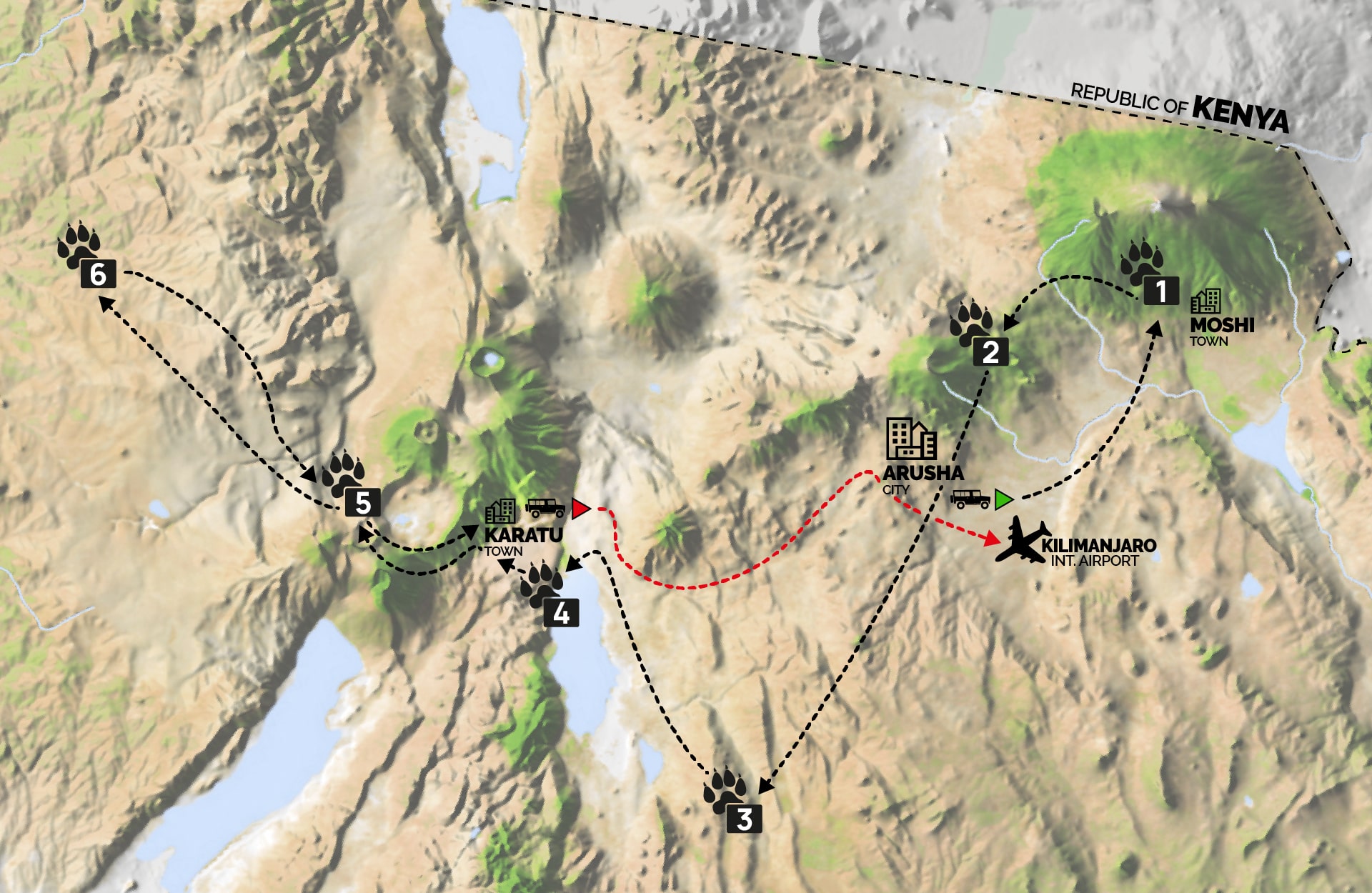 (Tempo indicativo transfer Karatu•Arusha: 2 h 30 min • Karatu•Aeroporto del Kilimangiaro: 3 h 30 min)