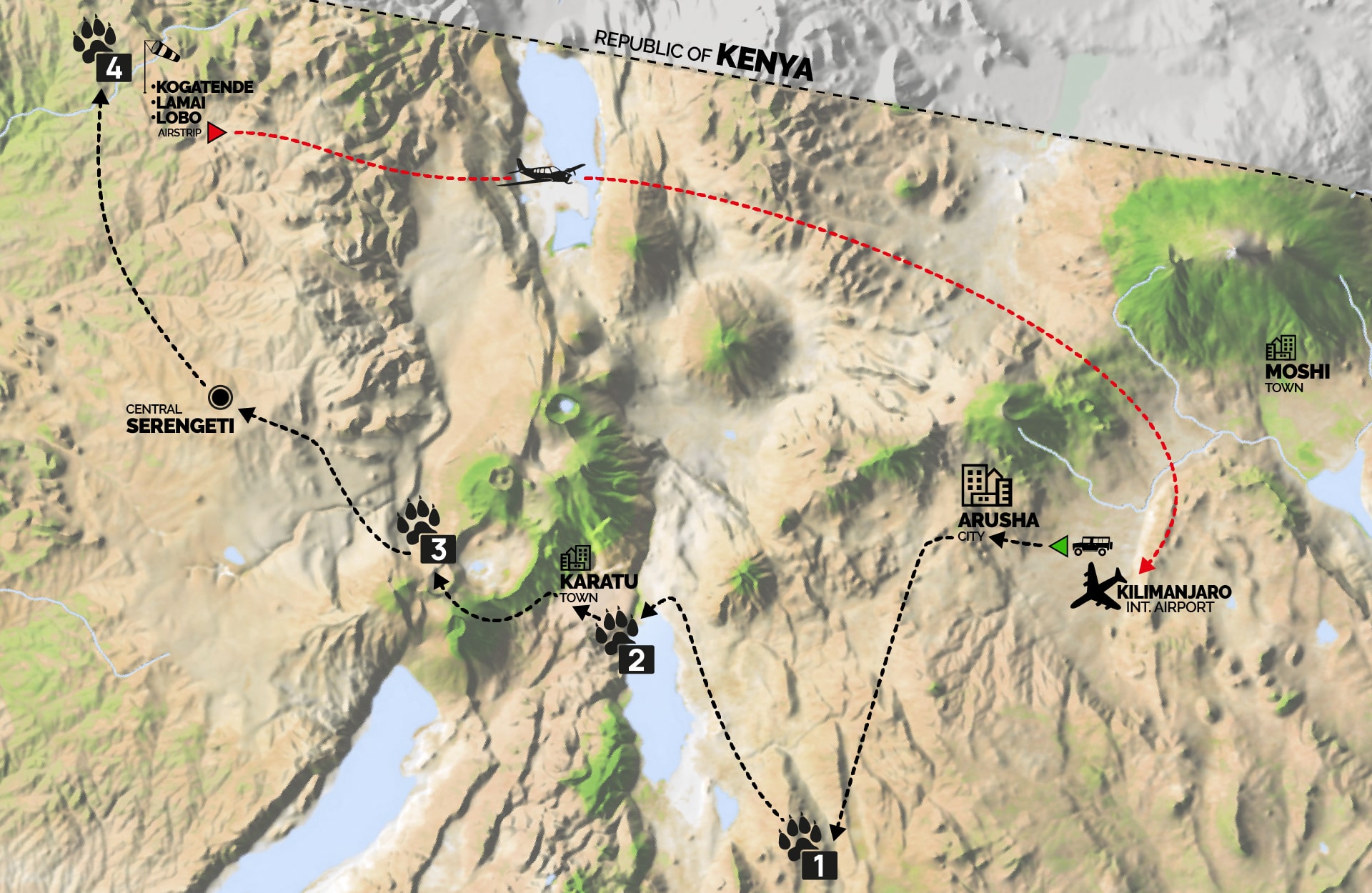 Dopo la colazione, trasferimento all’Airstrip e volo di linea per l’aeroporto del Kilimangiaro. (Tempo indicativo volo: 1 h 30 min)