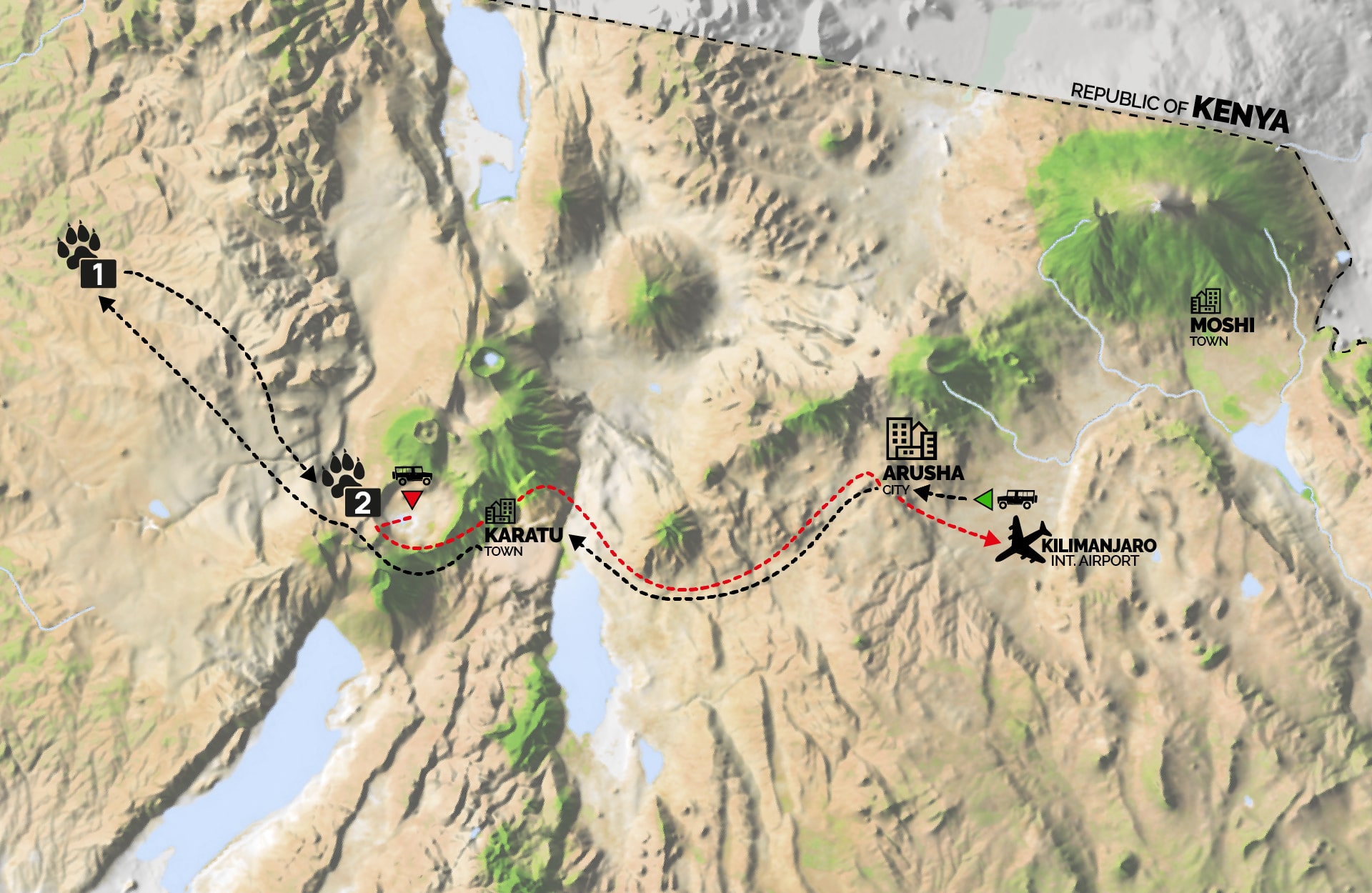 (Tempo indicativo transfer Cratere di Ngorongoro•Arusha: 4 h • Cratere di Ngorongoro•Aeroporto del Kilimangiaro: 5 h)