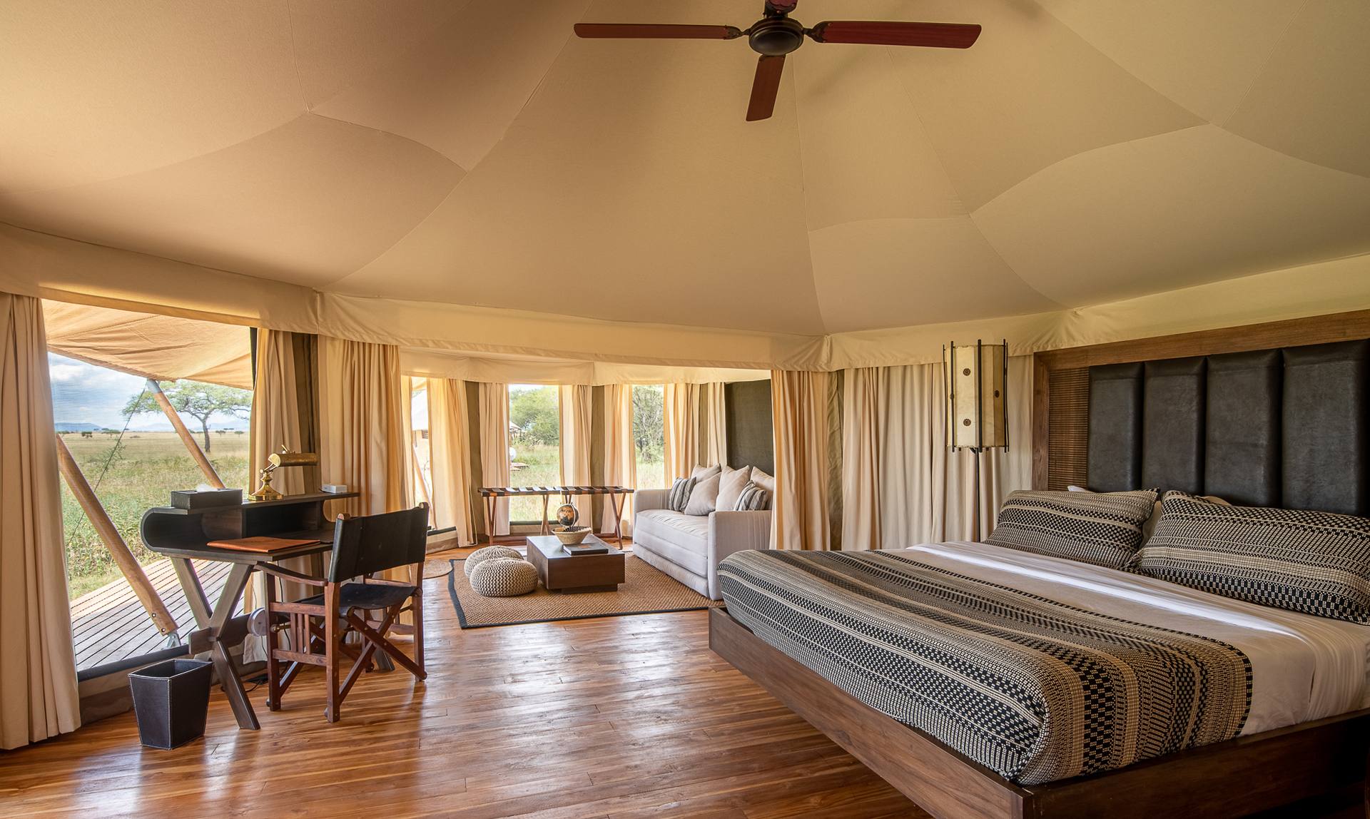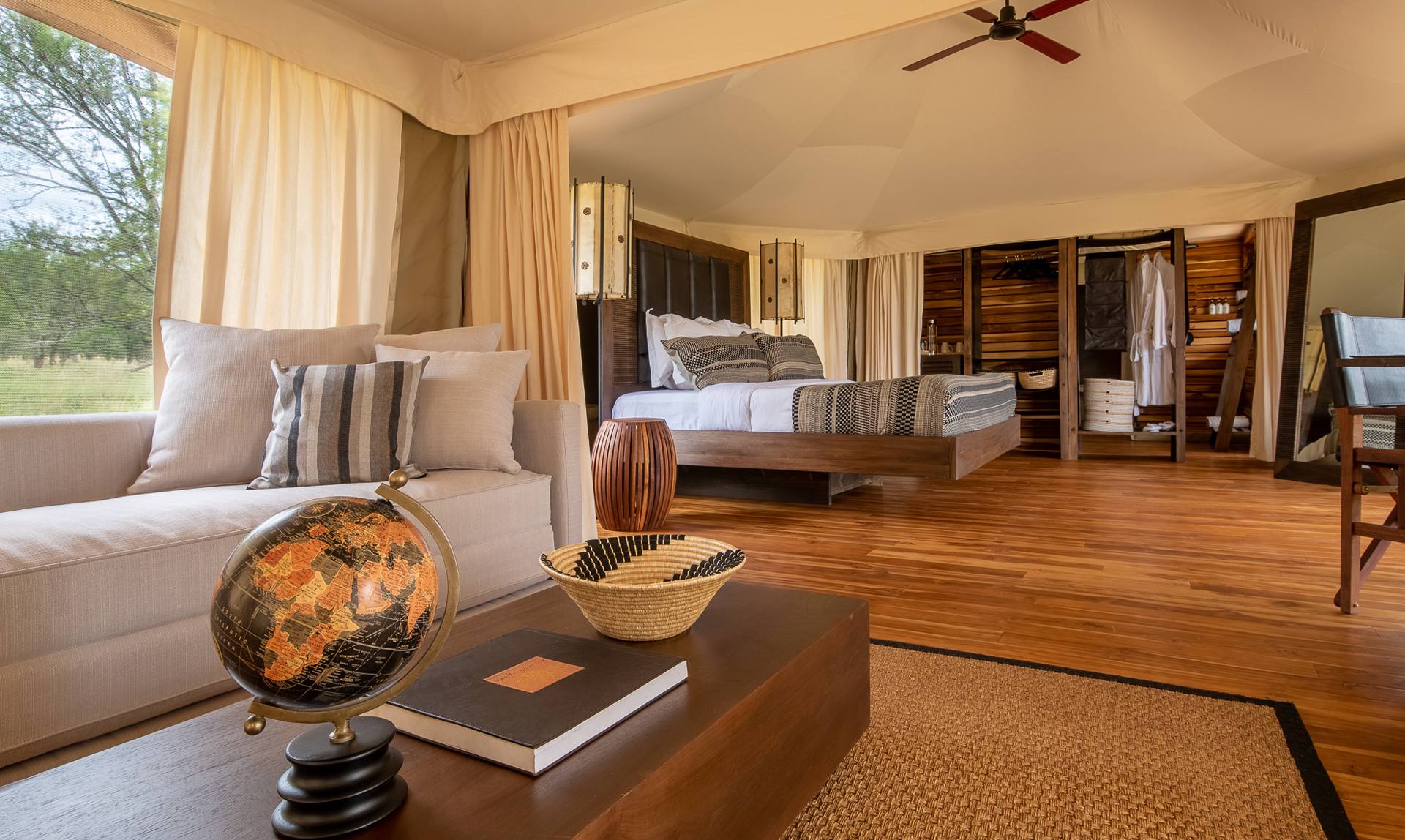 Situato vicino al fiume Mara, dove le mandrie di gnu compiono il loro viaggio annuale alla ricerca di pascoli più verdi, Aurari Camp offre un rifugio rigenerante in mezzo alla natura selvaggia del Serengeti. Ogni spaziosa tenda per gli ospiti, splendidamente arredata, dispone di una spaziosa camera da letto al centro, di un’ala adibita a salotto, di un’ala adibita a bagno e di una veranda privata all’aperto.